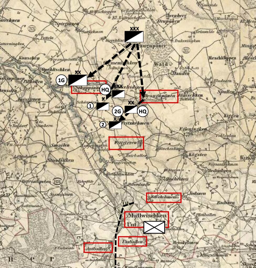 La 1 divisione Guardie di cavalleria avanza verso Schuppinen, due brigate affiancate. reggimenti in linea e squadroni su due linee e si fortifica. Seconda divisione Guardie passando su Draguponnen, da li si divide, la seconda brigata su Pitzkemen si fortifica, la prima brigata su Schonvies si fortifica. Il comando della seconda divisione nello spazio a meta’ tra le due brigate.
