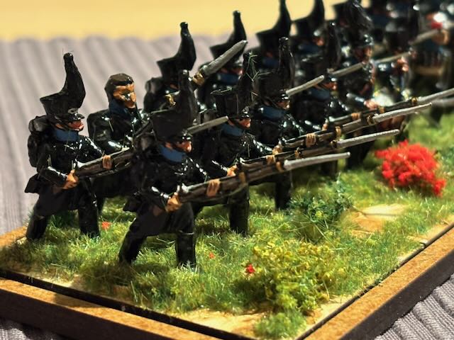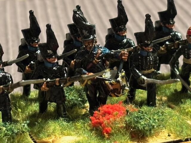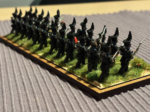 Just finished basing this iconic Life Guard battalion of the Black Brunswickers, figures are mainly 25mm Minifigs, with drummers from an unknown manufacturer. No flags were carried by this battalion during the Waterloo campaign, so I complied. Photos soon.