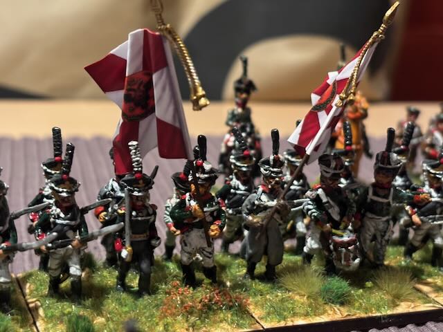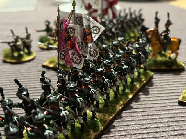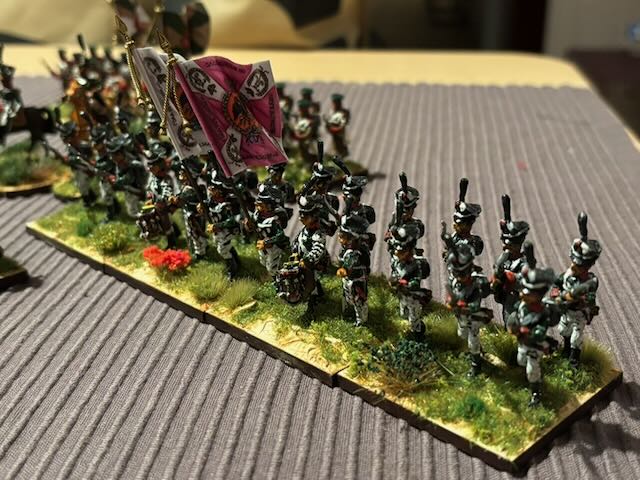 Just restored and based, need flocking, two battalions of Russian Napoleonic grenadiers, from Kiev and St Petersburg Grenadier regiments. One battalion is mainly Hinchliffe, while the other is from an unknown manufacturer, maybe Old Glory? Flags are GMB.
