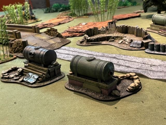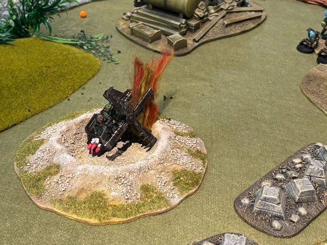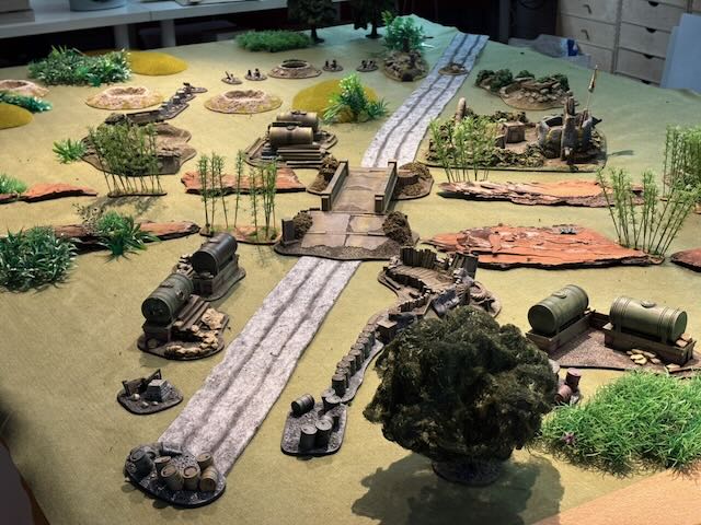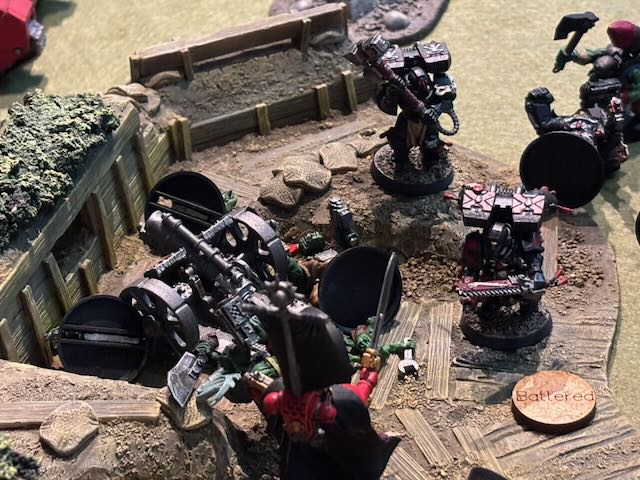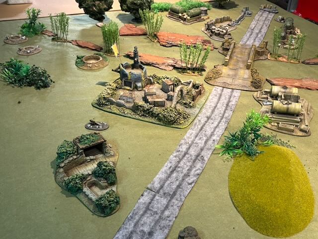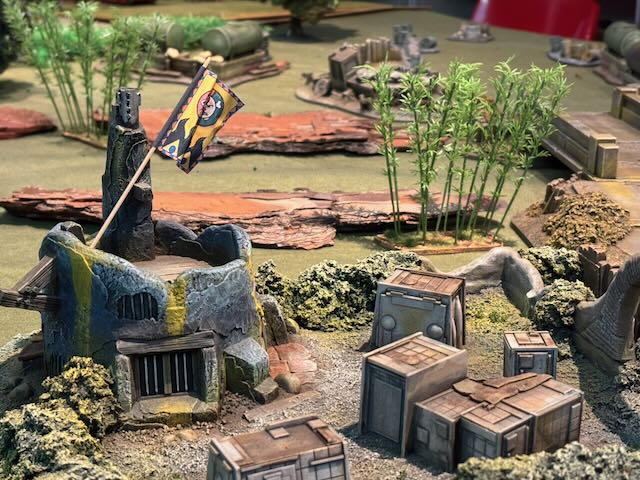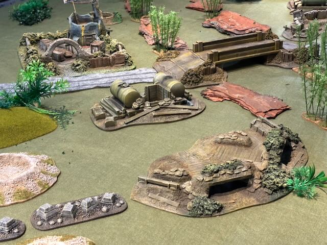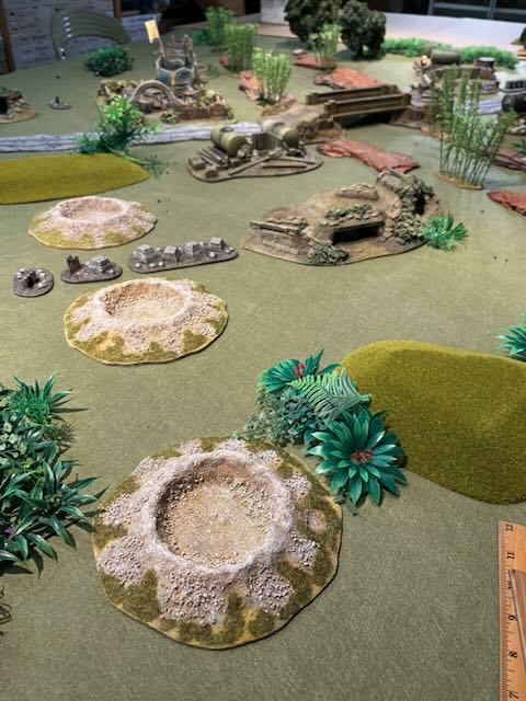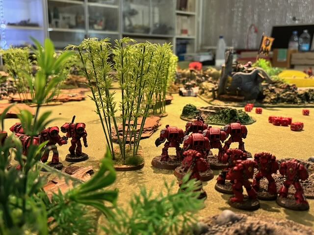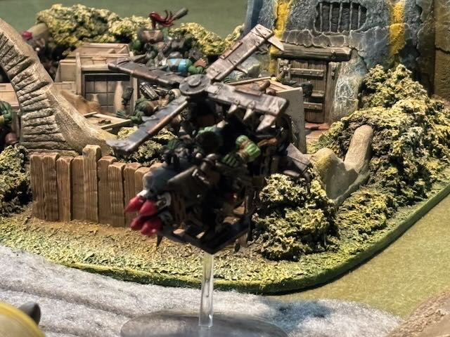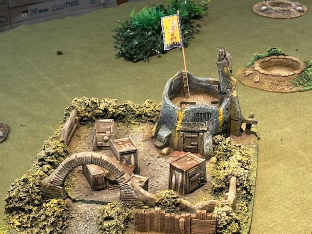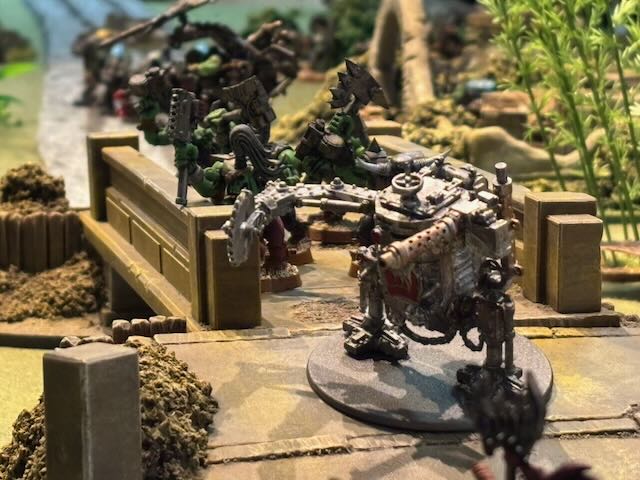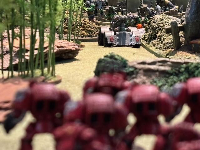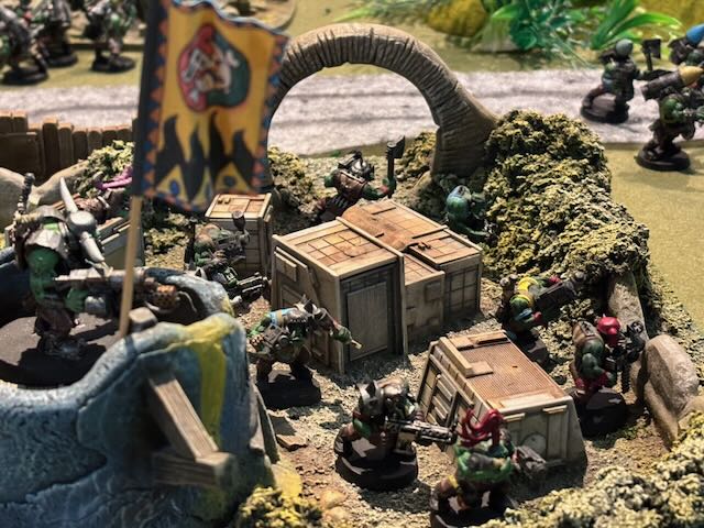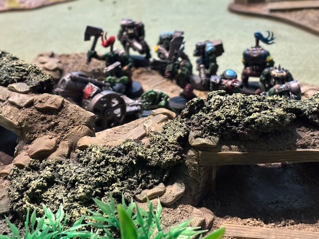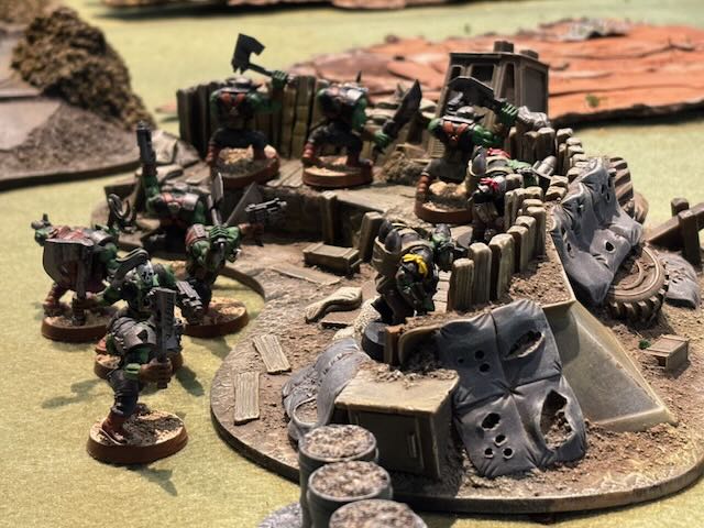 Here the table layout, an Orkish all-round defence being attacked by a Space Marines platoon being dropped from a Spaceship.
