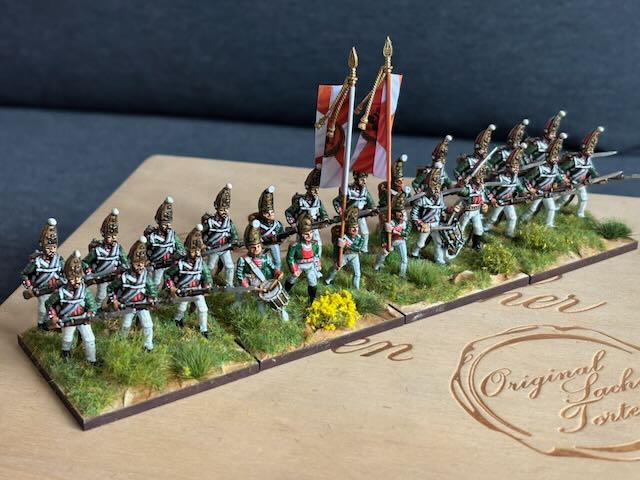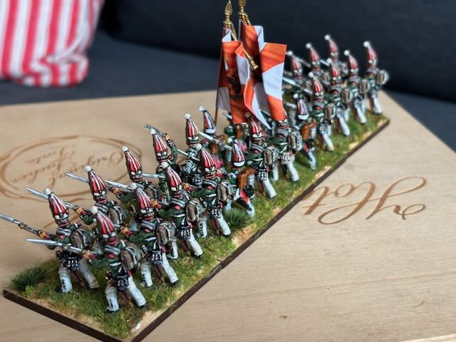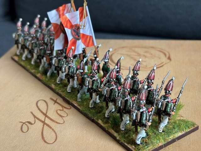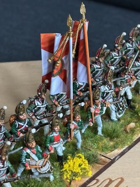 Just completed the restoration of very old but brilliantly painted miniatures from Mirliton. They were not enough to build a battalion so I resorted to a few vintage Minifigs to build the units. They have been painted reasonably close to the colours used in the models already painted. I am quite happy. Flags from GMB.